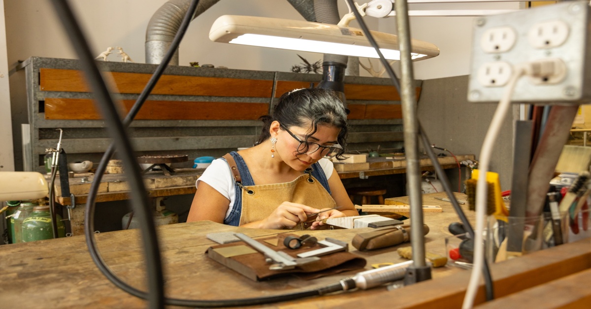 An artist wearing glasses and an apron sits at a workbench in Harbourfront Centre’s Craft & Design metal studio, using small tools to shape her work under a bright overhead light.